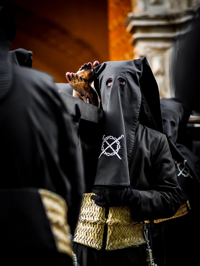 Túnica negra con larga cola que se extiende en determinadas procesiones y fechas; capirote negro con el anagrama bordado en blanco sobre el antifaz, cinturón de esparto con su cuerda de 3 metros, mediante la cual van unidos los hermanos. Del cuello cuelga una cruz de madera negra con el anagrama de la cofradía. El color del hábito y el esparto son signos de austeridad y luto en la hora en que murió Cristo. Las hachas se apoyan en el cinturón durante los desfiles procesionales.